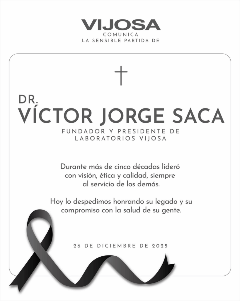 Laboratorios Vijosa informó el fallecimiento del doctor Víctor Jorge Saca, fundador y presidente de la compañía, ocurrido el 26 de diciembre de 2025. La empresa comunicó la noticia a través de una esquela oficial en la que destacó su legado humano y profesional tras más de cinco décadas de liderazgo en el sector de la salud.
