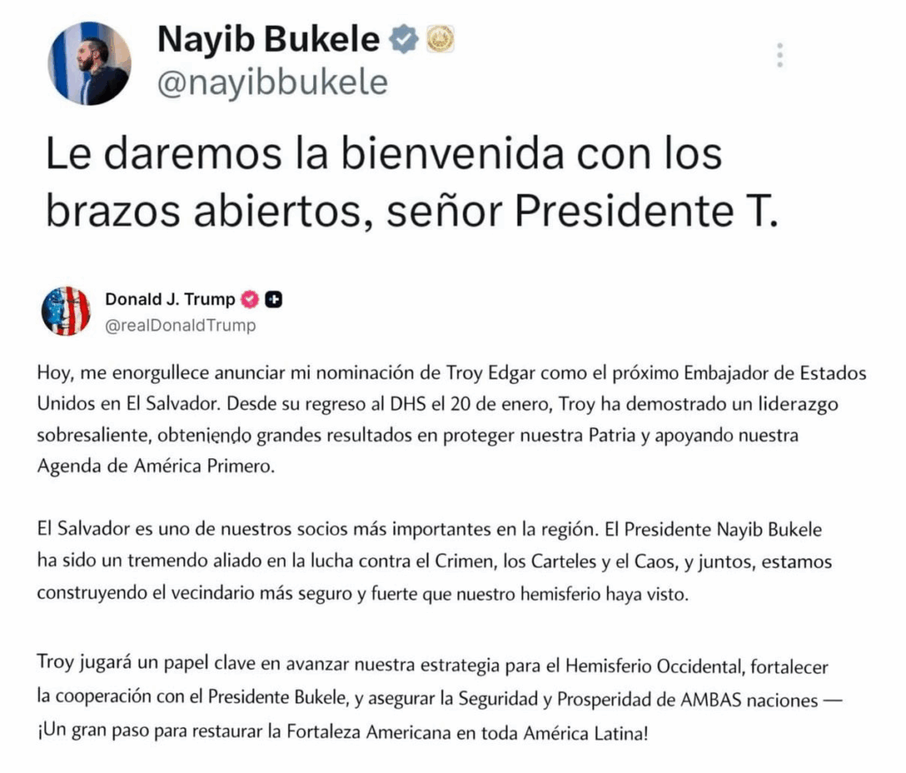 Finalmente, Troy Edgar agradeció públicamente la nominación y el respaldo recibido. En un mensaje difundido en X, expresó su gratitud al presidente Donald Trump por la confianza depositada en él para representar a Estados Unidos en El Salvador, así como al presidente Nayib Bukele por su apoyo, subrayando la importancia de continuar fortaleciendo la cooperación bilateral entre ambas naciones.