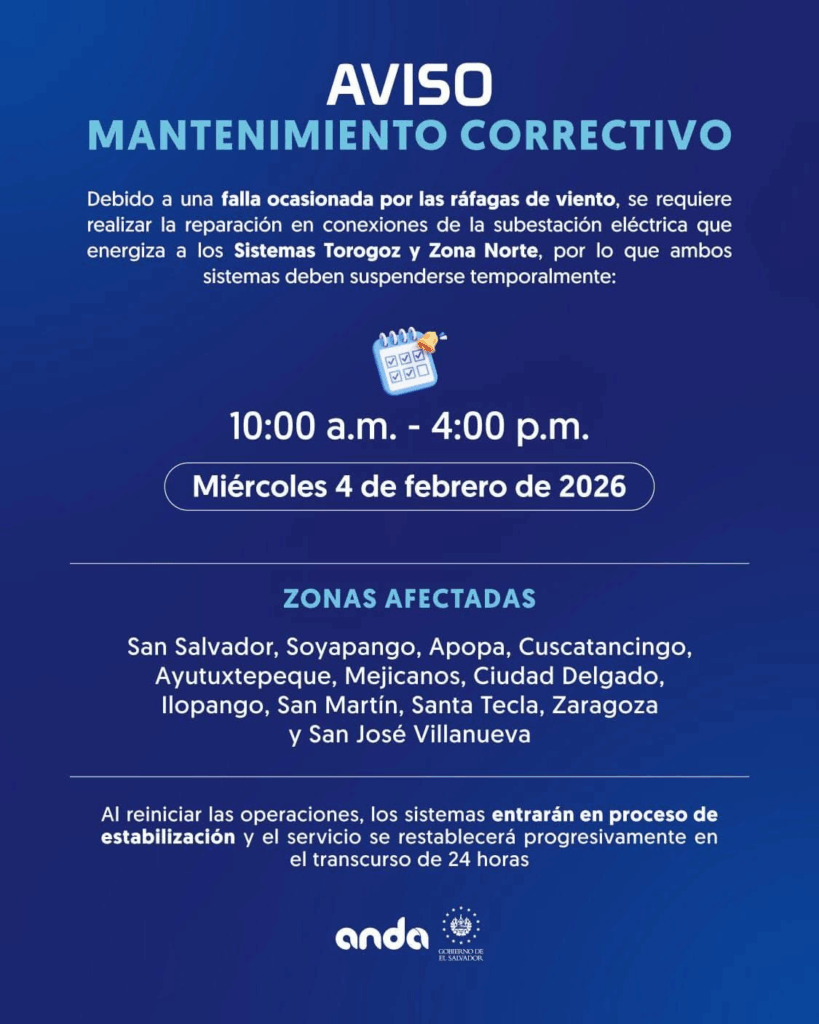 La Administración Nacional de Acueductos y Alcantarillados (ANDA) informó que este miércoles 4 de febrero de 2026 se realizará un mantenimiento correctivo debido a una falla ocasionada por las fuertes ráfagas de viento, lo que obligará a la suspensión temporal del servicio de agua potable en varias zonas del país.