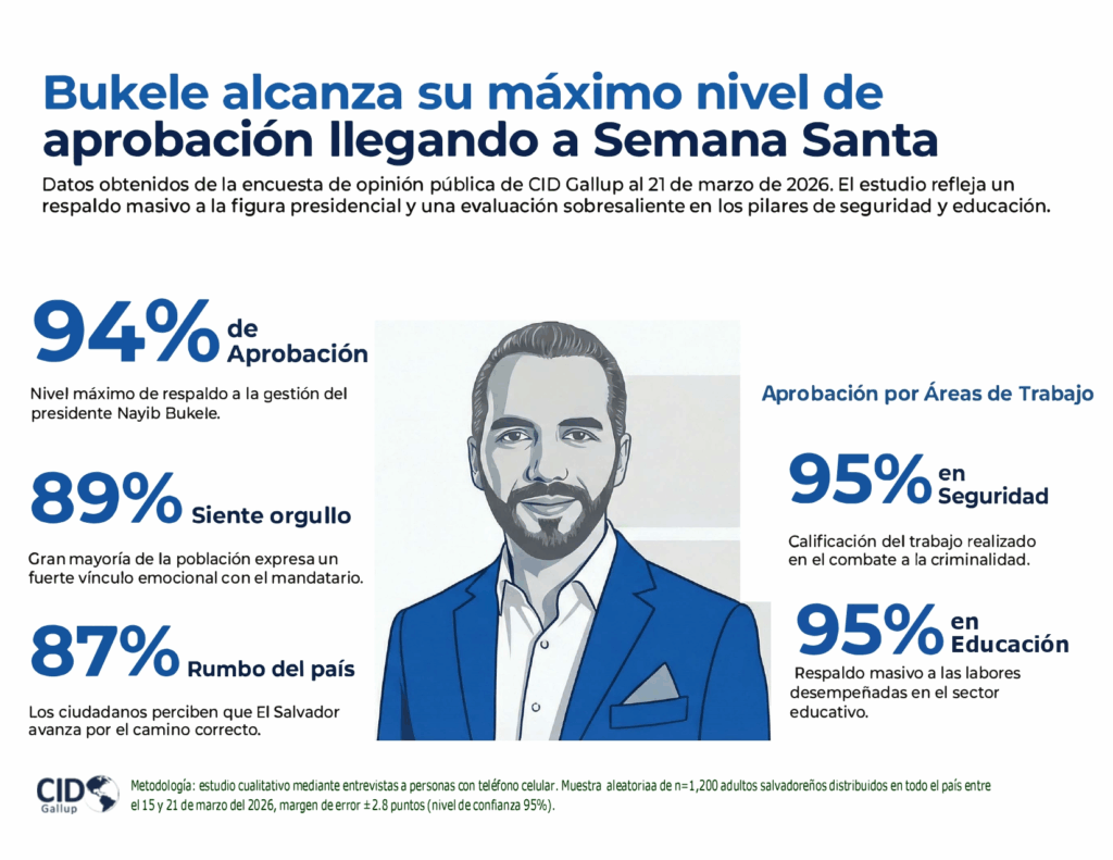 CID Gallup detalló que el estudio se basó en entrevistas a 1,200 adultos salvadoreños a nivel nacional, con un margen de error de ±2.8 puntos y un nivel de confianza del 95%.