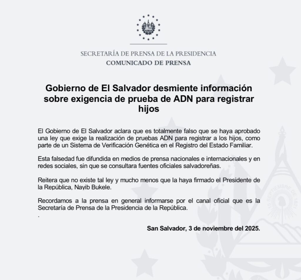 A través de un comunicado oficial, el Ejecutivo aclaró que es “totalmente falso” que exista un Sistema de Verificación Genética como parte del proceso de inscripción de nacimientos. Asimismo, señaló que no se ha aprobado ninguna normativa relacionada con este tema, ni ha sido firmada por el Presidente de la República, Nayib Bukele.