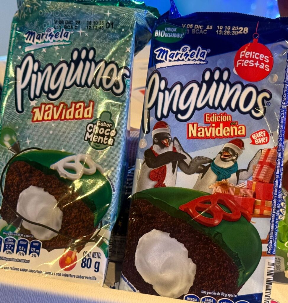 • Pingüinos Navidad 80g: pastelito de chocolate relleno de crema con cobertura verde y firulito rojo, alusivos a la temporada.