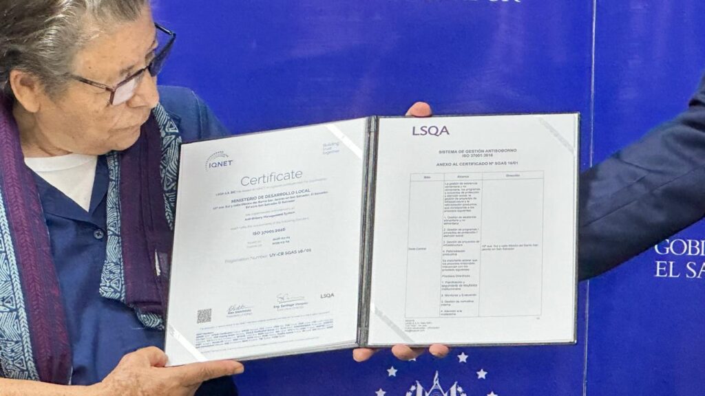 Con el compromiso, liderazgo, y apoyo de la Alta Dirección, bajo el mandato del Presidente Nayib Bukele, el MINDEL asume con determinación el desarrollo y fortalecimiento de una cultura de cero tolerancia ante el soborno o cualquier práctica similar. Con la recepción de la Certificación Antisoborno ISO 37001 garantizamos que la institución cumple con la implementación efectiva de controles y medidas de gestión antisoborno, fortaleciendo la transparencia institucional y la prevención de la corrupción.