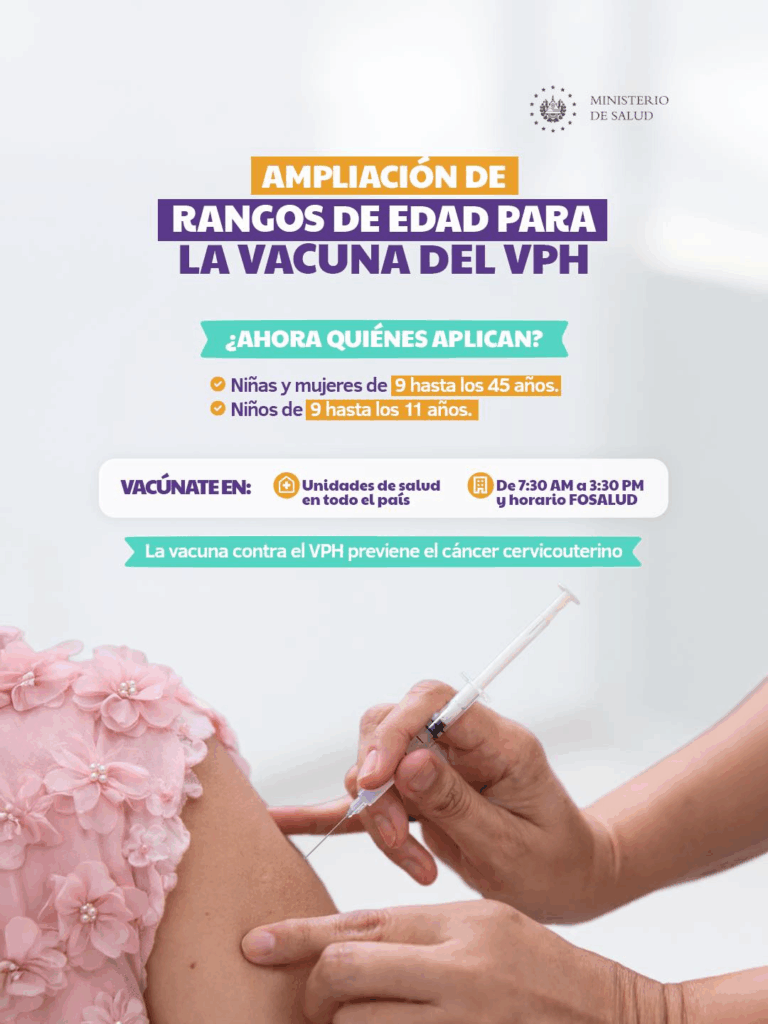 El Ministerio de Salud (MINSAL) anunció la ampliación del rango de edad para la aplicación de la vacuna contra el Virus del Papiloma Humano (VPH), como parte de las estrategias para fortalecer la prevención de enfermedades asociadas a este virus en el país.