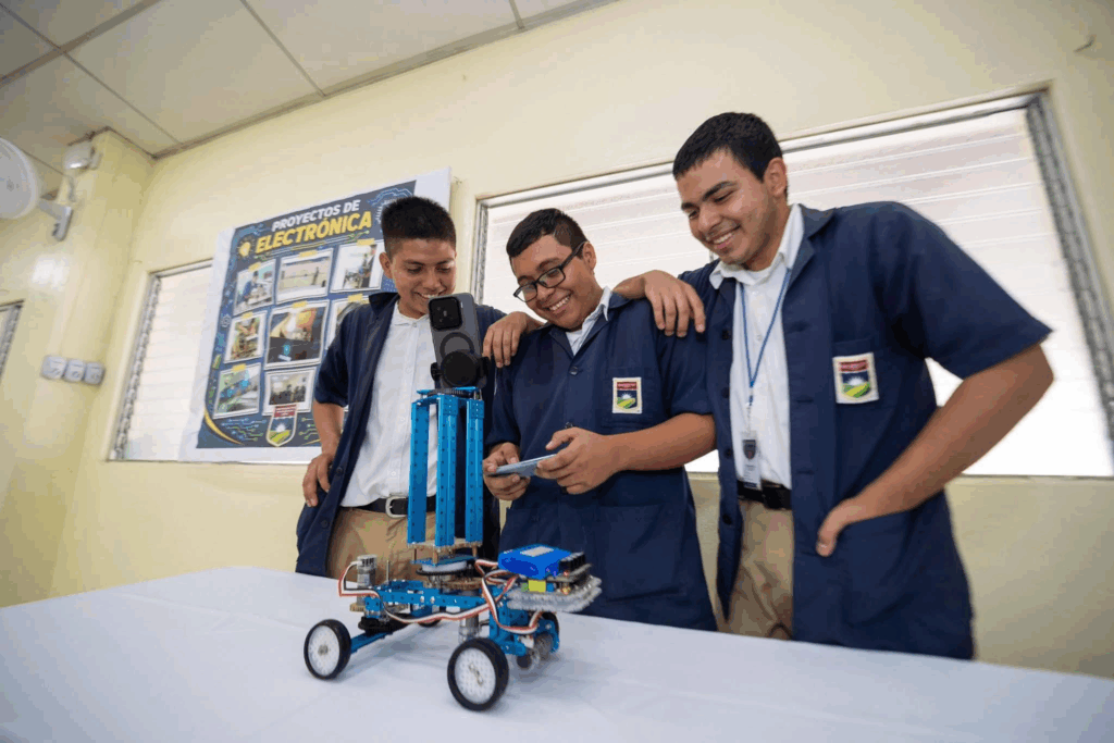 Durante su visita al Complejo Educativo Católico Nuestra Señora de La Paz, la ingeniera conoció proyectos de robótica desarrollados por estudiantes, evidenciando el avance de la educación tecnológica en el país.