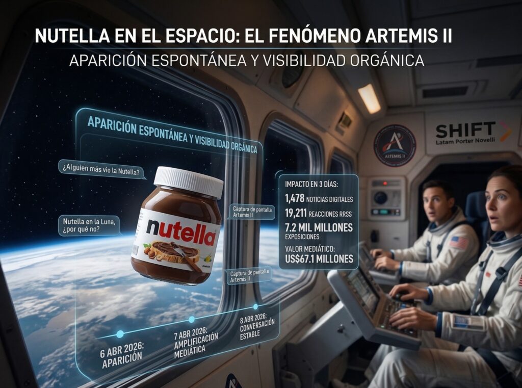 Un frasco de Nutella flotando frente a cámara durante una transmisión vinculada a la misión Artemis II bastó para detonar una conversación global que, en cuestión de horas, se transformó en noticia internacional. Así lo demuestra el más reciente estudio regional de SHIFT Latam Porter Novelli, que analiza cómo una aparición espontánea puede convertirse en uno de los ejemplos más potentes de visibilidad orgánica reciente.